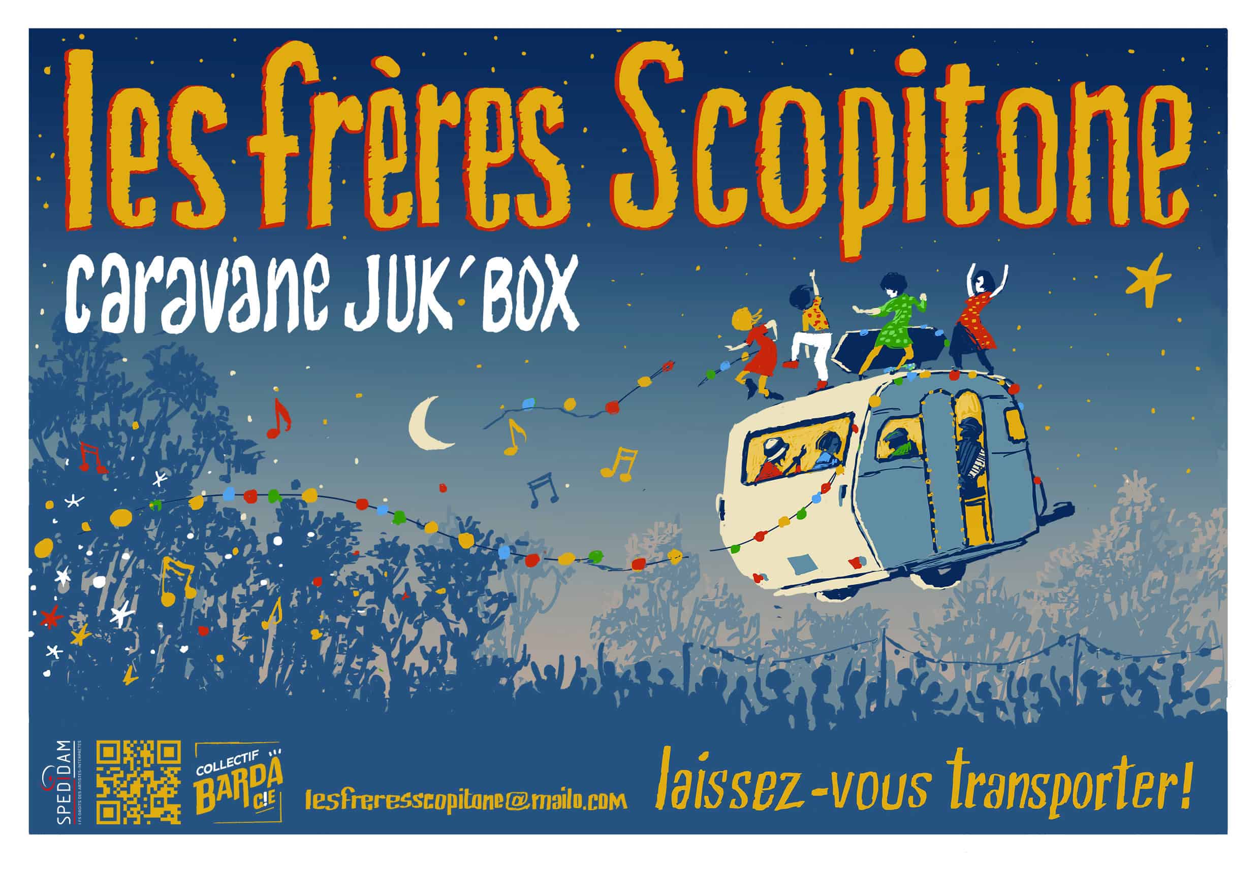 Telle une attraction foraine, Les Frères Scopitone ont pour vocation de se produire dans des lieux aussi divers et variés que les marchés, les fêtes foraines, les terrasses de cafés, les parvis des théâtres, les chapiteaux, les festivals…